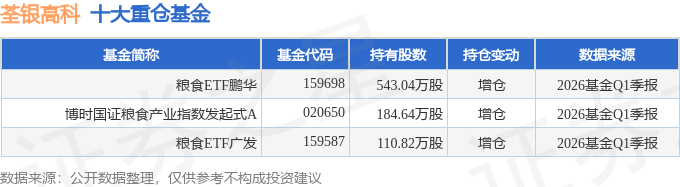 持有荃银高科最多的基金为粮食ETF鹏华,目前规模为11.93亿元,最新净值1.0721(4月24日),较上一交易日上涨0.33%,近一年上涨22.6%。该基金现任基金经理为陈龙。