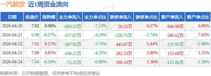 资金流向数据方面,本周一汽解放主力资金合计净流出1869.78万元,游资资金合计净流入724.31万元,散户资金合计净流入1145.47万元。本周资金流向一览见下表: