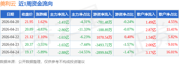资金流向数据方面,本周美利云主力资金合计净流出10.44亿元,游资资金合计净流出6293.39万元,散户资金合计净流入11.07亿元。本周资金流向一览见下表: