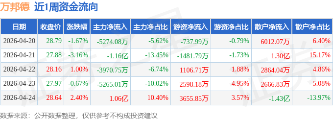 资金流向数据方面,本周万邦德主力资金合计净流出1.54亿元,游资资金合计净流入5140.96万元,散户资金合计净流入1.03亿元。本周资金流向一览见下表: