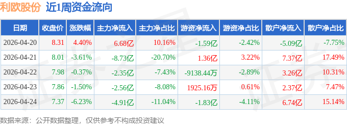 资金流向数据方面,本周利欧股份主力资金合计净流出11.87亿元,游资资金合计净流出2.78亿元,散户资金合计净流入14.65亿元。本周资金流向一览见下表: