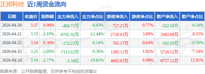 资金流向数据方面,本周正邦科技主力资金合计净流出2.98亿元,游资资金合计净流入1.03亿元,散户资金合计净流入1.96亿元。本周资金流向一览见下表: