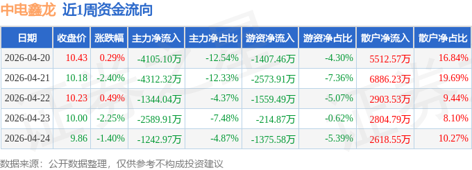 资金流向数据方面,本周中电鑫龙主力资金合计净流出1.36亿元,游资资金合计净流出7131.31万元,散户资金合计净流入2.07亿元。本周资金流向一览见下表: