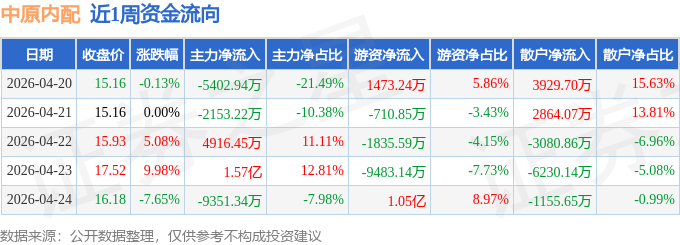 资金流向数据方面,本周中原内配主力资金合计净流入3722.23万元,游资资金合计净流出49.35万元,散户资金合计净流出3672.88万元。本周资金流向一览见下表: