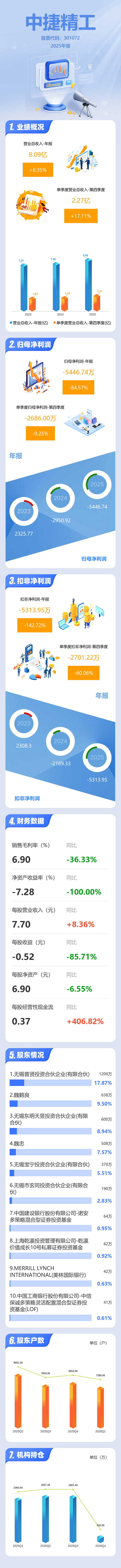 证券之星消息,中捷精工2025年年报显示,当年度公司主营收入8.09亿元,同比上升8.36%;归母净利润-5446.74万元,同比下降84.58%;扣非净利润-5313.95万元,同比下降142.72%;其中2025年第四季度,公司单季度主营收入2.27亿元,同比上升17.11%;单季度归母净利润-2686.0万元,同比下降9.25%;单季度扣非净利润-2701.22万元,同比下降60.06%;负债率42.93%,投资收益-25.69万元,财务费用62.26万元,毛利率6.9%。