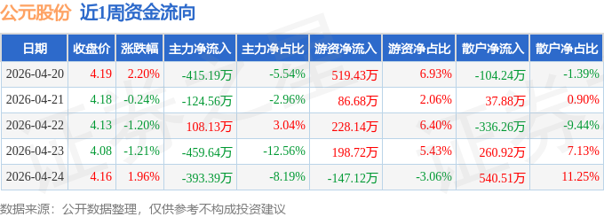 资金流向数据方面,本周公元股份主力资金合计净流出1284.66万元,游资资金合计净流入885.85万元,散户资金合计净流入398.81万元。本周资金流向一览见下表: