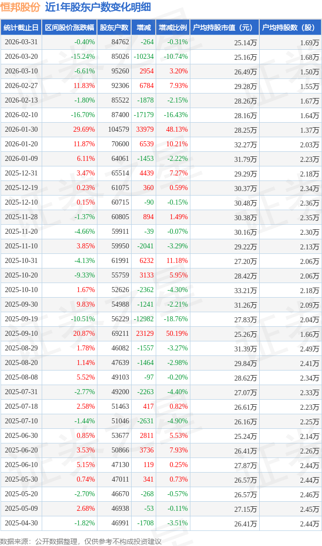 从股价来看,2026年3月20日至2026年3月31日,恒邦股份区间跌幅为0.4%,在此期间股东户数减少264.0户,减幅为0.31%。