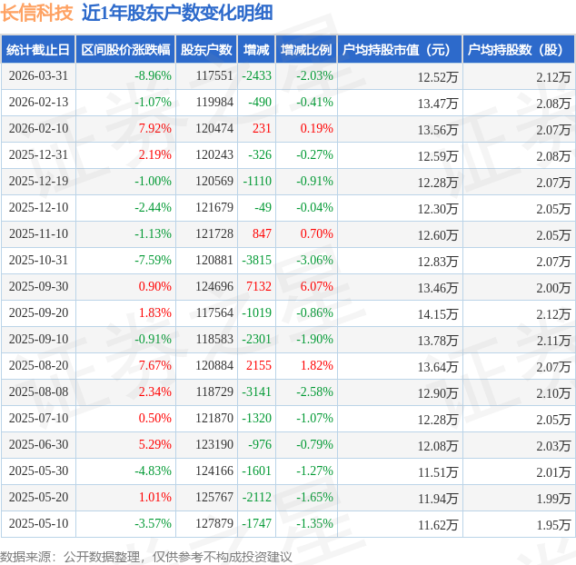 从股价来看,2026年2月13日至2026年3月31日,长信科技区间跌幅为8.96%,在此期间股东户数减少2433.0户,减幅为2.03%。