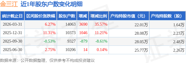 从股价来看,2025年12月31日至2026年3月31日,金三江区间涨幅为6.27%,在此期间股东户数增加3690.0户,增幅为35.57%。