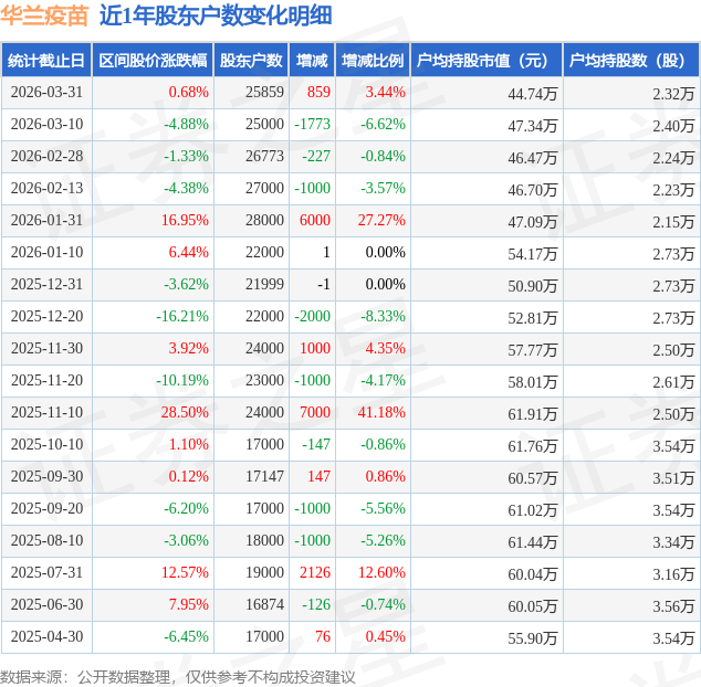 证券之星消息,近日华兰疫苗披露,截至2026年3月31日公司股东户数为2.59万户,较3月20日增加859.0户,增幅为3.44%。户均持股数量由上期的2.4万股减少至2.32万股,户均持股市值为44.74万元。