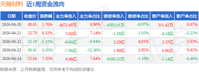 证券之星消息,截至2026年4月24日收盘,天赐材料(002709)报收于53.04元,较上周的48.79元上涨8.71%。本周,天赐材料4月24日盘中最高价报54.22元,股价触及近一年最高点。4月20日盘中最低价报47.58元。天赐材料当前最新总市值1081.25亿元,在电池板块市值排名3/96,在两市A股市值排名188/5200。