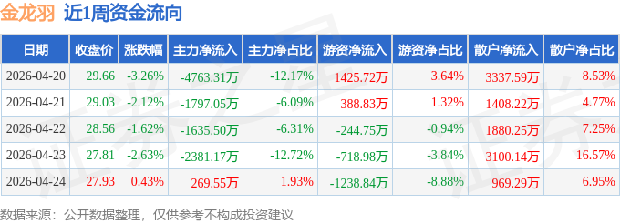 资金流向数据方面,本周金龙羽主力资金合计净流出1.03亿元,游资资金合计净流出388.01万元,散户资金合计净流入1.07亿元。本周资金流向一览见下表: