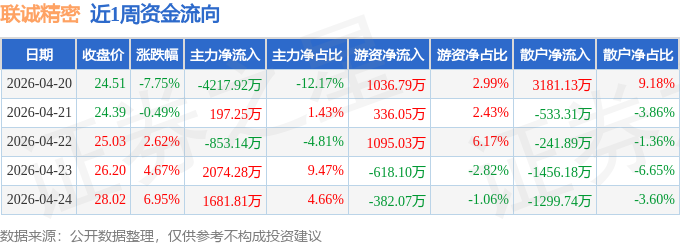 资金流向数据方面,本周联诚精密主力资金合计净流出1117.71万元,游资资金合计净流入1467.7万元,散户资金合计净流出349.99万元。本周资金流向一览见下表:
