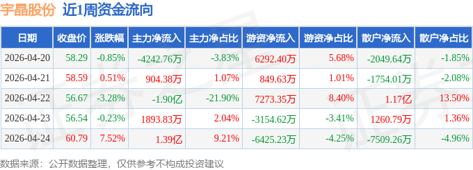 资金流向数据方面,本周宇晶股份主力资金合计净流出6464.63万元,游资资金合计净流入4835.52万元,散户资金合计净流入1629.11万元。本周资金流向一览见下表: