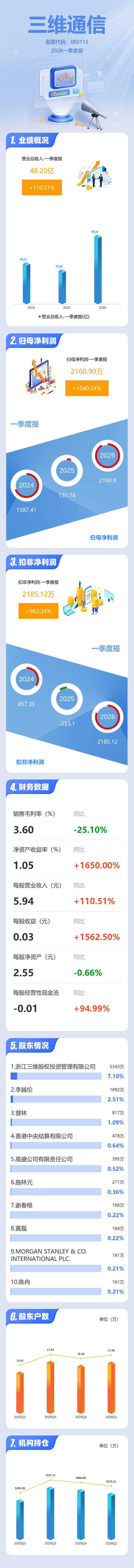 证券之星消息,三维通信2026年一季报显示,一季度公司主营收入48.2亿元,同比上升110.51%;归母净利润2160.9万元,同比上升1540.24%;扣非净利润2185.12万元,同比上升963.34%;负债率53.29%,投资收益68.2万元,财务费用1764.08万元,毛利率3.6%。