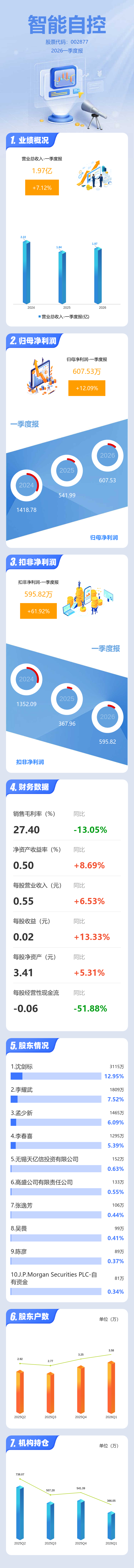 证券之星消息,智能自控2026年一季报显示,一季度公司主营收入1.97亿元,同比上升7.13%;归母净利润607.53万元,同比上升12.09%;扣非净利润595.82万元,同比上升61.93%;负债率50.0%,投资收益-17.85万元,财务费用434.22万元,毛利率27.4%。
