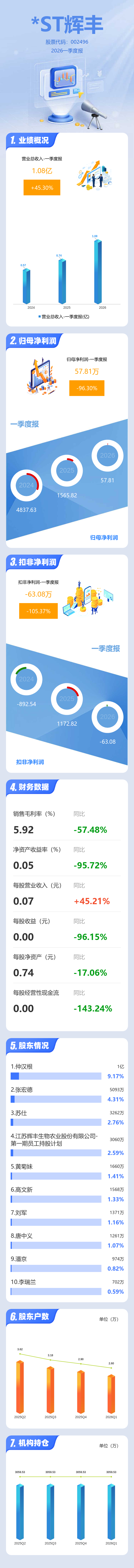 证券之星消息,*ST辉丰2026年一季报显示,一季度公司主营收入1.08亿元,同比上升45.3%;归母净利润57.81万元,同比下降96.31%;扣非净利润-63.08万元,同比下降105.38%;负债率46.37%,投资收益1735.56万元,财务费用454.85万元,毛利率5.92%。