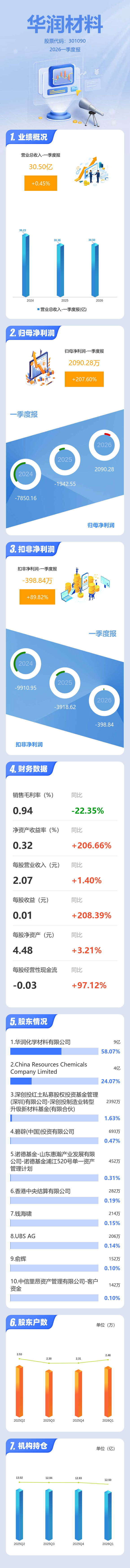 证券之星消息,华润材料2026年一季报显示,一季度公司主营收入30.5亿元,同比上升0.45%;归母净利润2090.28万元,同比上升207.6%;扣非净利润-398.84万元,同比上升89.82%;负债率27.11%,投资收益893.18万元,财务费用570.92万元,毛利率0.94%。