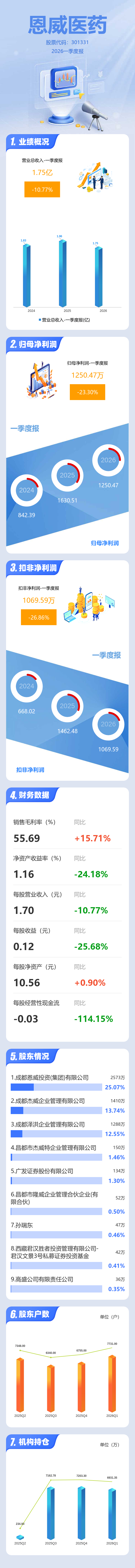 证券之星消息,恩威医药2026年一季报显示,一季度公司主营收入1.75亿元,同比下降10.77%;归母净利润1250.47万元,同比下降23.31%;扣非净利润1069.59万元,同比下降26.86%;负债率27.53%,投资收益139.19万元,财务费用34.07万元,毛利率55.69%。