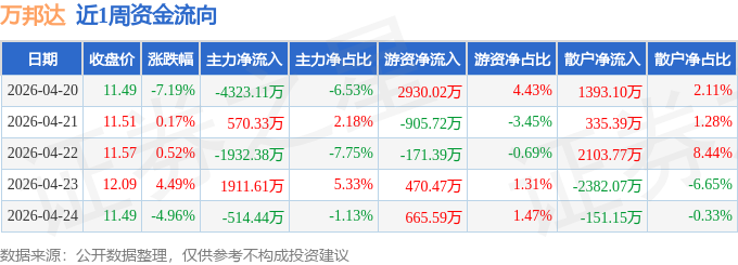 资金流向数据方面,本周万邦达主力资金合计净流出4288.0万元,游资资金合计净流入2988.96万元,散户资金合计净流入1299.03万元。本周资金流向一览见下表: