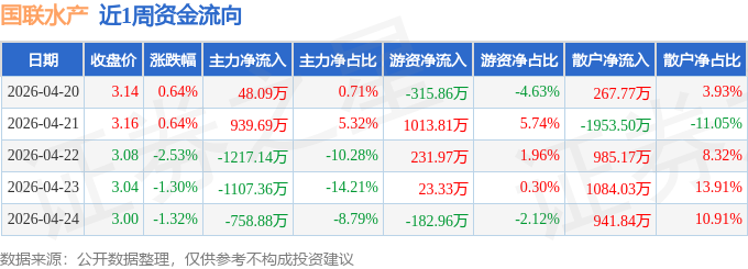 资金流向数据方面,本周国联水产主力资金合计净流出2095.59万元,游资资金合计净流入770.28万元,散户资金合计净流入1325.31万元。本周资金流向一览见下表: