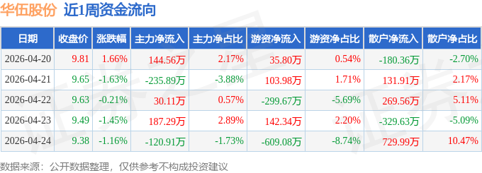 资金流向数据方面,本周华伍股份主力资金合计净流入5.16万元,游资资金合计净流出626.63万元,散户资金合计净流入621.47万元。本周资金流向一览见下表: