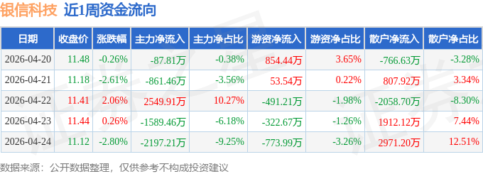 资金流向数据方面,本周银信科技主力资金合计净流出2186.04万元,游资资金合计净流出679.88万元,散户资金合计净流入2865.92万元。本周资金流向一览见下表: