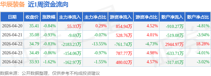 资金流向数据方面,本周华辰装备主力资金合计净流出2454.62万元,游资资金合计净流入1889.75万元,散户资金合计净流入564.86万元。本周资金流向一览见下表: