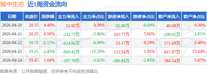 资金流向数据方面,本周冠中生态主力资金合计净流出1972.82万元,游资资金合计净流入237.65万元,散户资金合计净流入1735.18万元。本周资金流向一览见下表: