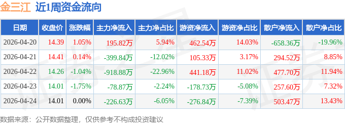 资金流向数据方面,本周金三江主力资金合计净流出1428.41万元,游资资金合计净流入553.49万元,散户资金合计净流入874.92万元。本周资金流向一览见下表: