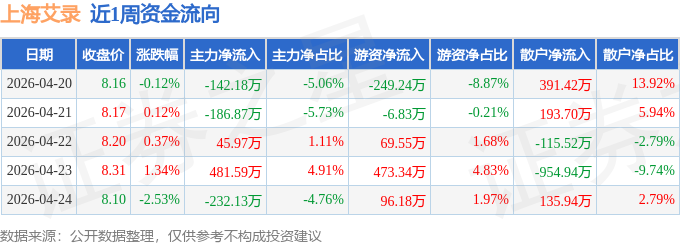 资金流向数据方面,本周上海艾录主力资金合计净流出33.62万元,游资资金合计净流入383.02万元,散户资金合计净流出349.4万元。本周资金流向一览见下表: