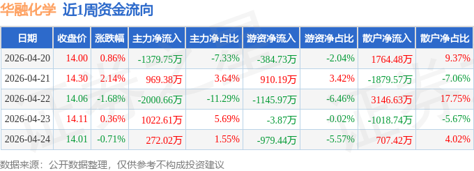 资金流向数据方面,本周华融化学主力资金合计净流出1116.41万元,游资资金合计净流出1603.82万元,散户资金合计净流入2720.22万元。本周资金流向一览见下表: