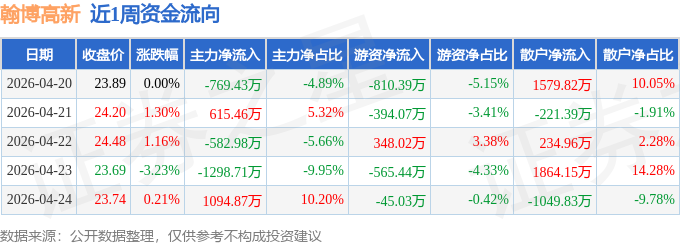 资金流向数据方面,本周翰博高新主力资金合计净流出940.79万元,游资资金合计净流出1466.91万元,散户资金合计净流入2407.71万元。本周资金流向一览见下表: