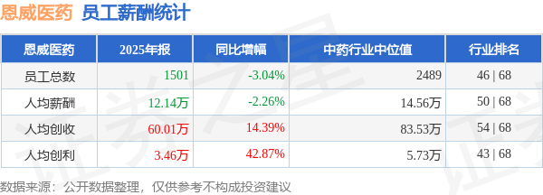 证券之星消息,4月27日恩威医药公布2025年年报,当年营收9.01亿元,同比增10.91%;净利润为5194.49万元,同比增38.53%。根据财报数据披露,当年公司员工总数1501人,同比减3.04%;人均薪酬12.14万元,同比减2.26%;人均创收60.01万元,同比增14.39%;人均创利3.46万元,同比增42.87%;公司员工薪酬统计见下表: