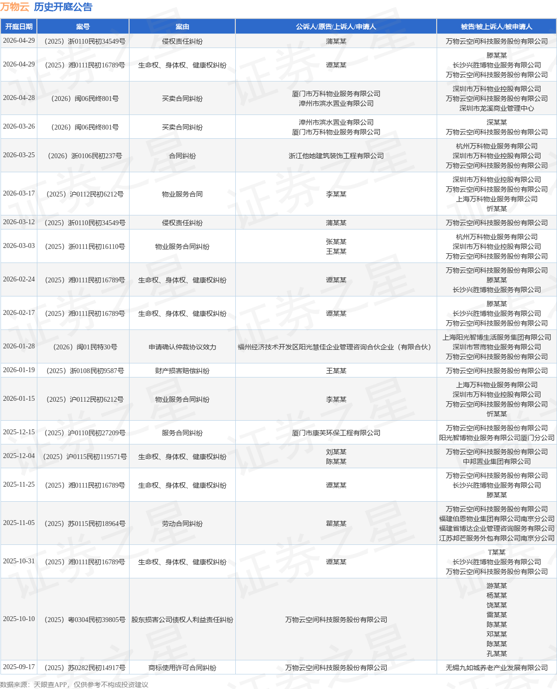 案号:(2025)浙0110民初34549号根据统计,近一年内以万物云空间科技服务股份有限公司为当事人的历史开庭公告有27则,其中案由为“生命权、身体权、健康权纠纷”的公告以7则居首,其次为“物业服务合同纠纷”有4则,“买卖合同纠纷”有3则。历史开庭公告(前20条)如下:
