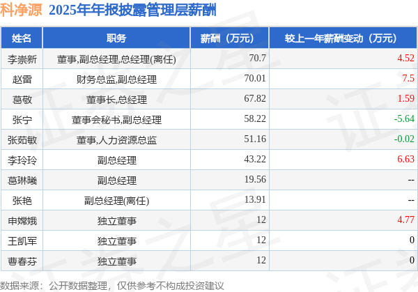 证券之星消息,科净源发布2025年年报,数据显示:公司主营收入2.76亿元,同比增44.43%。归母净利润为-3770.06万元,同比增71.24%。扣非净利润为-4419.23万元,同比增67.42%。当年公司员工总数337人,同比减8.42%。人均薪酬18.51万元(注:"人均薪酬"根据定期报告中"应付职工薪酬"附注的本期增加值 / 员工总数计算而来),同比增2.54%。人均创收81.98万元,同比增57.72%。其中管理层薪酬总额为430.6万元,同比上一年减6.12%,薪酬最高的为董事,副总经理,总经理(离任)李崇新,薪酬70.7万元。