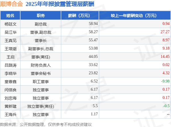 证券之星消息,顺博合金发布2025年年报,数据显示:公司主营收入159.85亿元,同比增14.37%。归母净利润为2.22亿元,同比增297.39%。扣非净利润为1.37亿元,同比增60.54%。当年公司员工总数2270人,同比增13.67%。人均薪酬10.27万元(注:"人均薪酬"根据定期报告中"应付职工薪酬"附注的本期增加值 / 员工总数计算而来),同比减0.8%。人均创收704.2万元,同比增0.62%。人均创利9.71万元,同比增200.97%。其中管理层薪酬总额为352.78万元,同比上一年增8.78%,薪酬最高的为副总裁杨廷文,薪酬58.94万元。