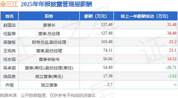 证券之星消息,金三江发布2025年年报,数据显示:公司主营收入4.48亿元,同比增16.24%。归母净利润为7638.89万元,同比增43.11%。扣非净利润为7544.08万元,同比增41.97%。当年公司员工总数385人,同比增2.94%。人均薪酬18.38万元(注:"人均薪酬"根据定期报告中"应付职工薪酬"附注的本期增加值 / 员工总数计算而来),同比增28.58%。人均创收116.4万元,同比增12.92%。人均创利19.84万元,同比增39.02%。其中管理层薪酬总额为563.78万元,同比上一年减2.15%,薪酬最高的为董事长赵国法,薪酬127.48万元。