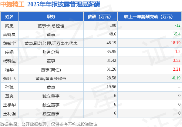 证券之星消息,中捷精工发布2025年年报,数据显示:公司主营收入8.09亿元,同比增8.36%。归母净利润为-5446.74万元,同比减84.58%。扣非净利润为-5313.95万元,同比减142.72%。当年公司员工总数1091人,同比增8.23%。人均薪酬12.99万元(注:"人均薪酬"根据定期报告中"应付职工薪酬"附注的本期增加值 / 员工总数计算而来),同比增5.83%。人均创收74.11万元,同比增0.11%。其中管理层薪酬总额为369.96万元,同比上一年减21.48%,薪酬最高的为董事长,总经理魏忠,薪酬108.0万元。
