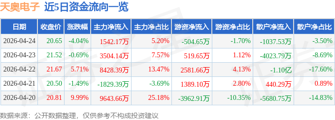 证券之星消息,截至2026年4月24日收盘,天奥电子(002935)报收于20.65元,下跌4.04%,换手率3.41%,成交量14.15万手,成交额2.97亿元。