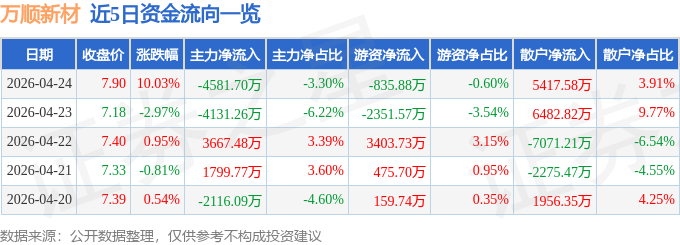 证券之星消息,截至2026年4月24日收盘,万顺新材(300057)报收于7.9元,上涨10.03%,换手率23.64%,成交量180.54万手,成交额13.86亿元。