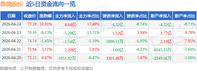 证券之星消息,截至2026年4月24日收盘,恩捷股份(002812)报收于77.18元,上涨10.01%,涨停,换手率8.02%,成交量65.96万手,成交额49.46亿元。
