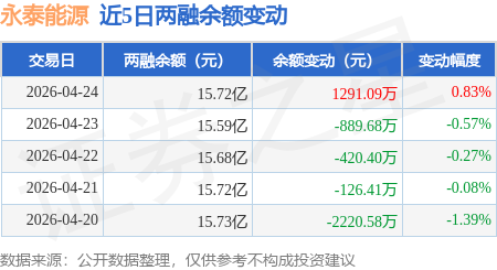 证券之星消息,4月24日,永泰能源(600157)融资买入1.96亿元,融资偿还1.82亿元,融资净买入1368.94万元,融资余额15.57亿元。