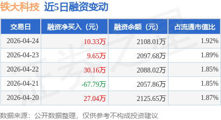 证券之星消息,4月24日,铁大科技(920541)融资买入92.04万元,融资偿还81.71万元,融资净买入10.33万元,融资余额2108.01万元,近3个交易日已连续净买入累计50.15万元,近20个交易日中有14个交易日出现融资净买入。