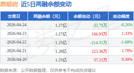 证券之星消息,4月24日,鼎熔岩(301028)融资买入635.69万元,融资偿还668.6万元,融资净卖出32.91万元,融资余额1.27亿元,近20个交易日中有11个交易日出现融资净买入。