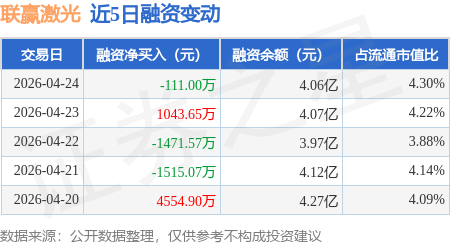 证券之星消息,4月24日,联赢激光(688518)融资买入4187.86万元,融资偿还4298.86万元,融资净卖出111.0万元,融资余额4.06亿元。