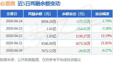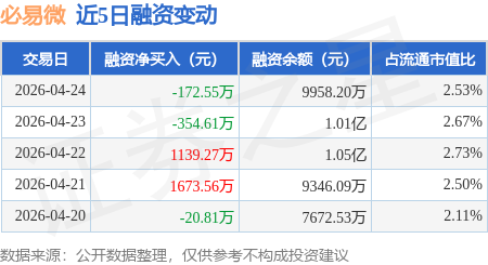 证券之星消息,4月24日,必易微(688045)融资买入2181.36万元,融资偿还2353.91万元,融资净卖出172.55万元,融资余额9958.2万元,近20个交易日中有11个交易日出现融资净买入。