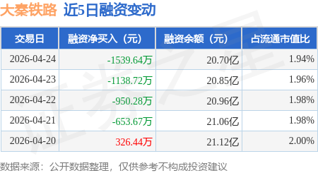 证券之星消息,4月24日,大秦铁路(601006)融资买入1995.33万元,融资偿还3534.97万元,融资净卖出1539.64万元,融资余额20.7亿元。