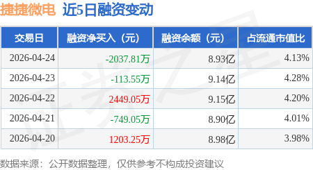 证券之星消息,4月24日,捷捷微电(300623)融资买入5488.3万元,融资偿还7526.1万元,融资净卖出2037.81万元,融资余额8.93亿元,近20个交易日中有11个交易日出现融资净买入。