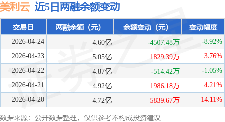 证券之星消息,4月24日,美利云(000815)融资买入1.11亿元,融资偿还1.56亿元,融资净卖出4504.24万元,融资余额4.6亿元,近20个交易日中有13个交易日出现融资净买入。